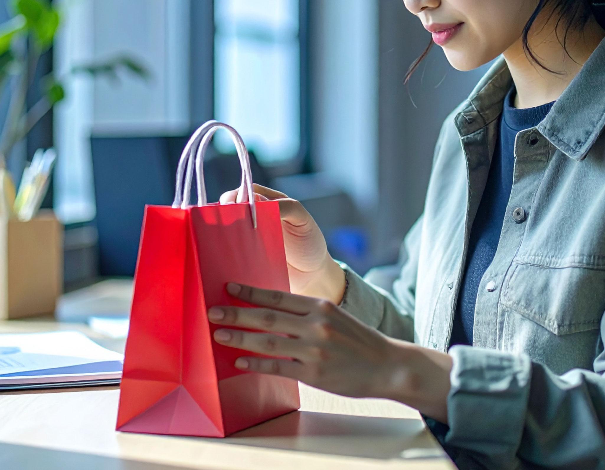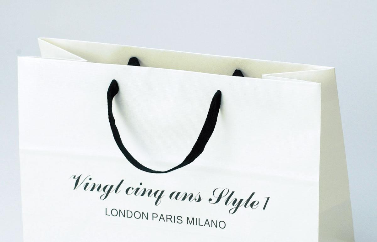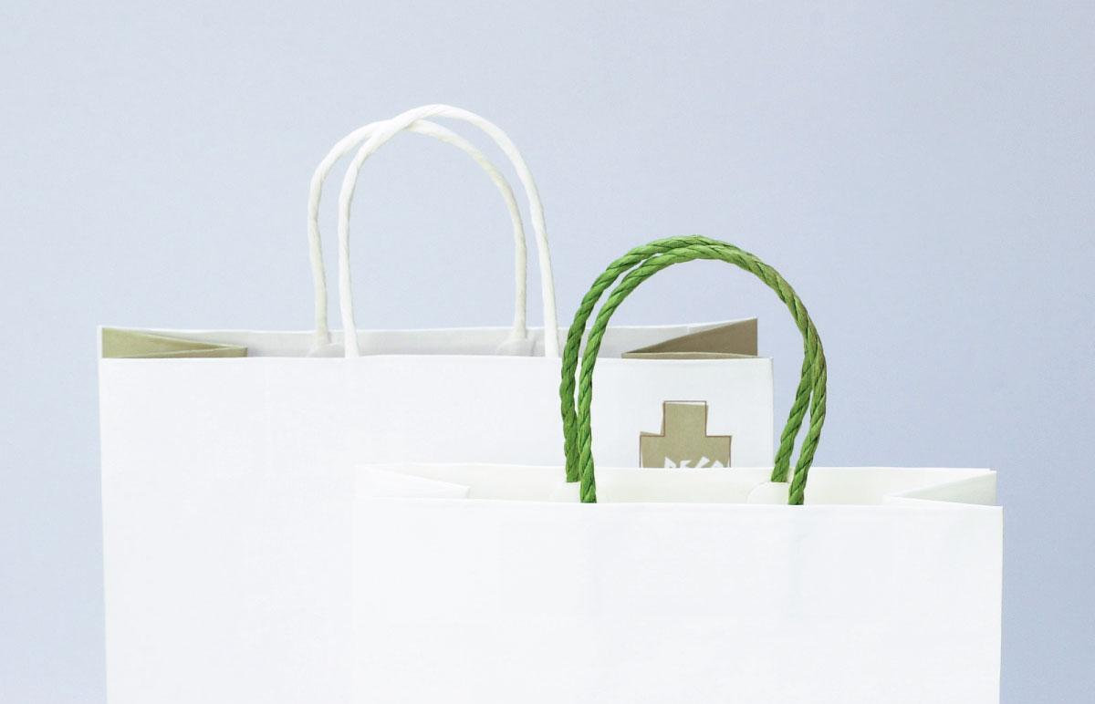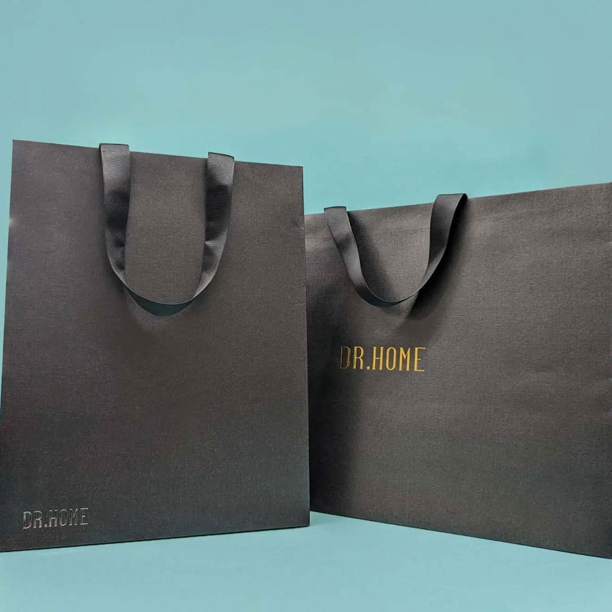 美容機器を開発・販売する会社。マットブラックを基調としエンボス加工の施された存在感のあるペーパーバッグは一見すると紙袋には見えない程素敵な仕上りとなりました。ひもを通す穴も結び目もなくどこから紐が出ているのかわからない程、すっきりとしたターントップ仕様に加え商品ブランド「DR.HOME」のロゴは印刷ではなく箔押しとなっており表面のマット感+箔の光沢の相性は100%です。